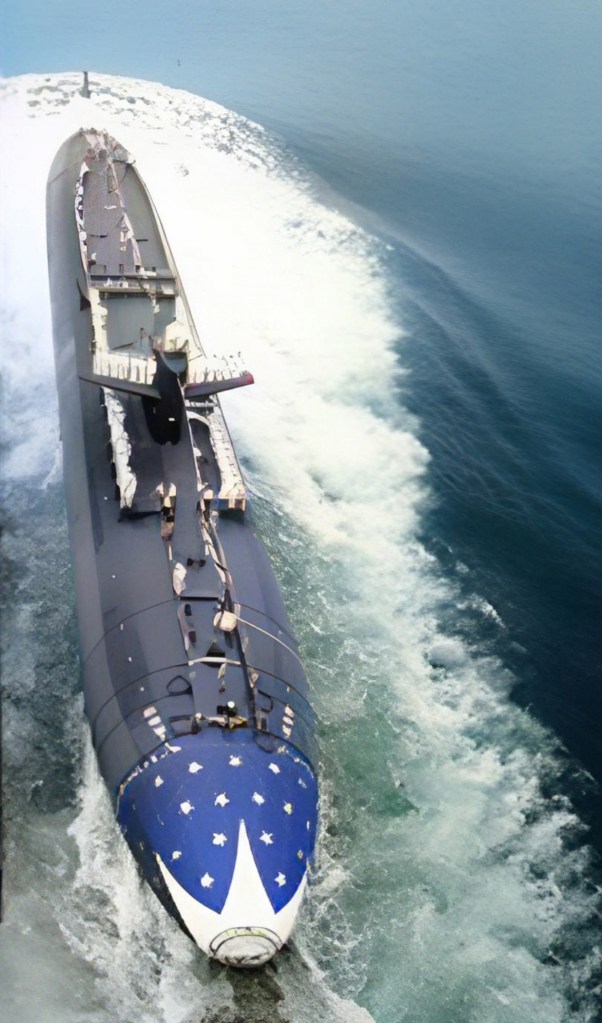 The Bremerton (SSN-698) slides down the launching ways at the Electric Boat Division of General Dynamics Corp., Groton, CT., 22 July 1978.