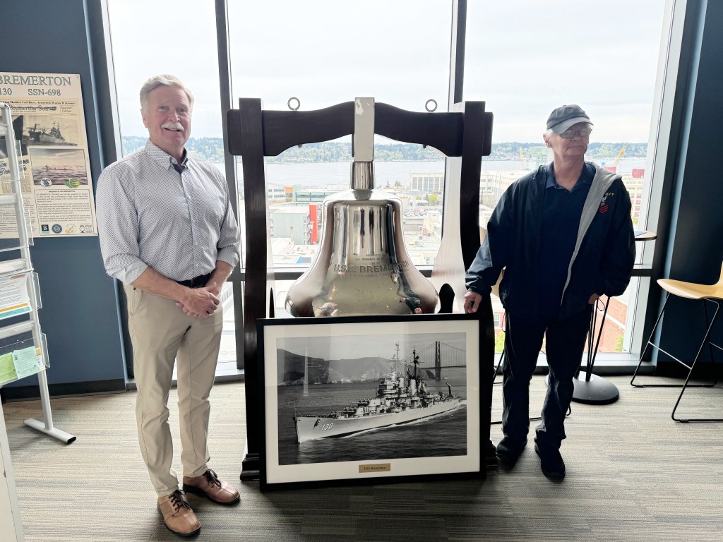 Rick Raymond presented a photograph of USS Bremerton CA-130 exiting San Francisco in 1955 to Mayor Greg Wheeler in a ceremony April 20, 2026. The ceremony took place in front of the ship’s bell on the sixth deck of city hall. The photo was donated by Charles Dachenhauson from his collection.