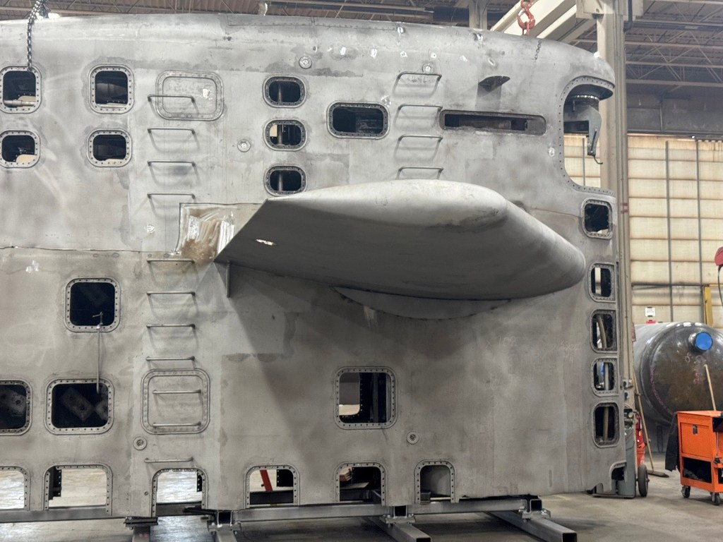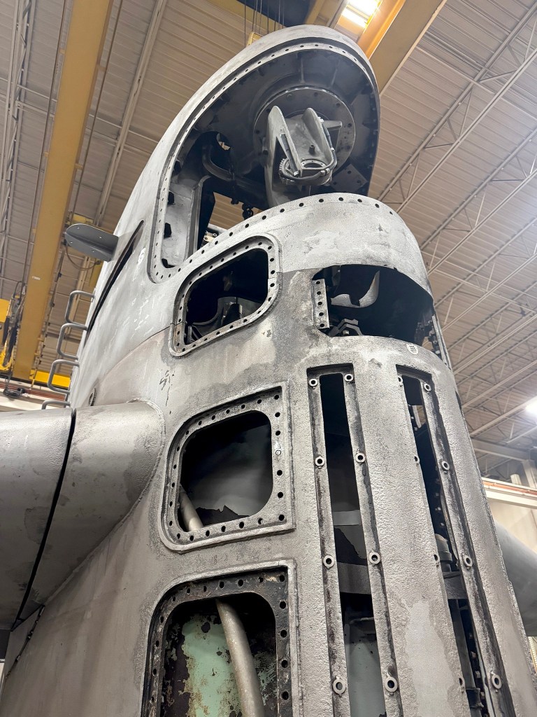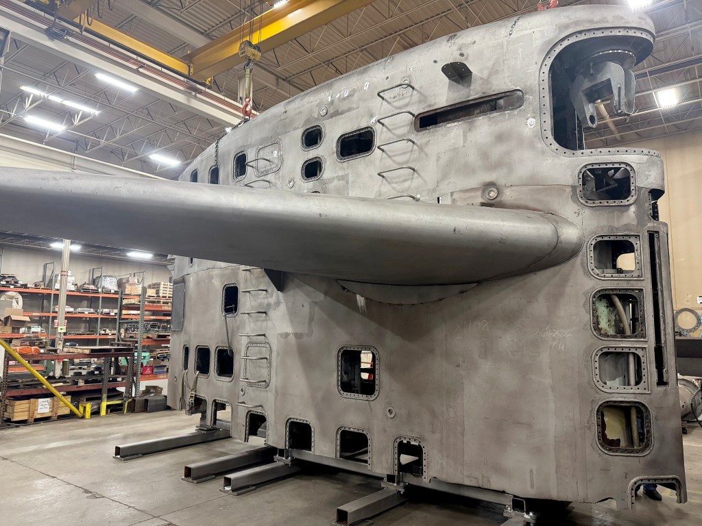 Minneapolis-St. Paul, SSN-708, sail undergoing restoration at a machine shop near St. Cloud, MN. Note how the sail was cut during decom – by following the horizontal line, L to R, starting just below the H2 overboard, then it goes vertical for a bit, then back to horizontal over the fairwater planes. The upper half is not currently connected to the lower half. Instead, it’s supported by two hoists. The machine shop will prepare the sail by ensuring everything fits back together and then weld the upper and lower pieces after trucked to the museum location near Camp Ripley. https://www.mnvetmuseum.org/ssn708