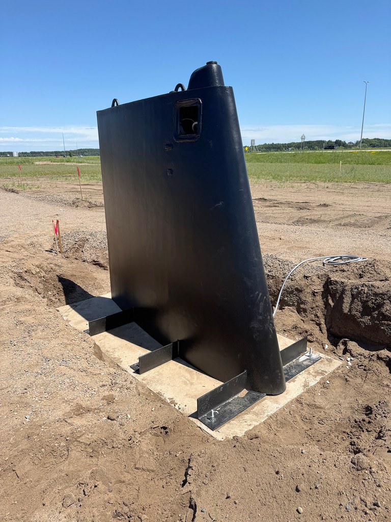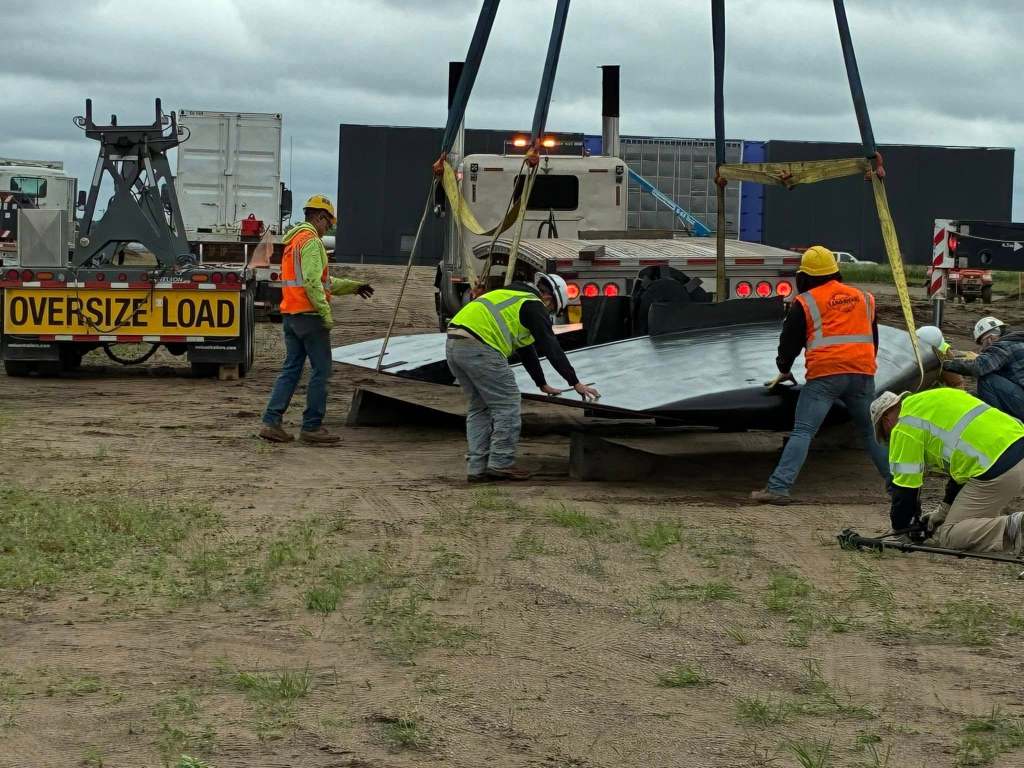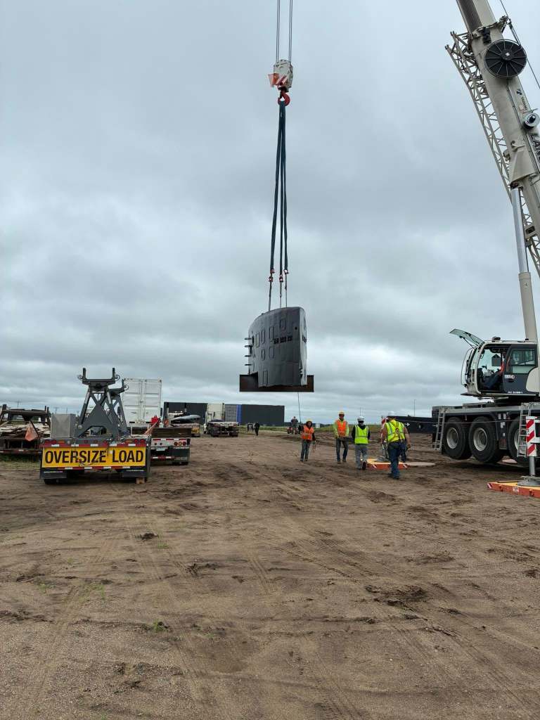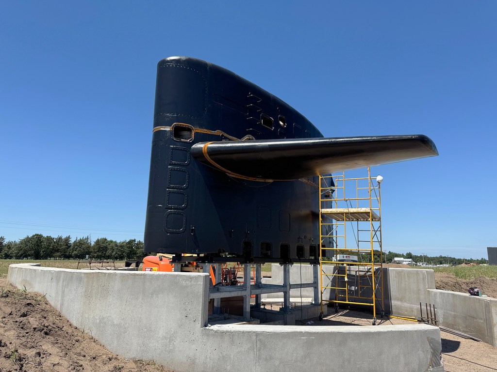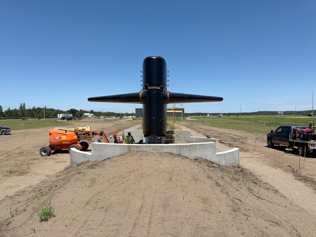 SSN-708’s sail and rudder have been installed at the Minnesota Military Museum’s new site. The sail is in place and welders are attaching the top half to the bottom. The earthen berm will serve as a representation of the hull.