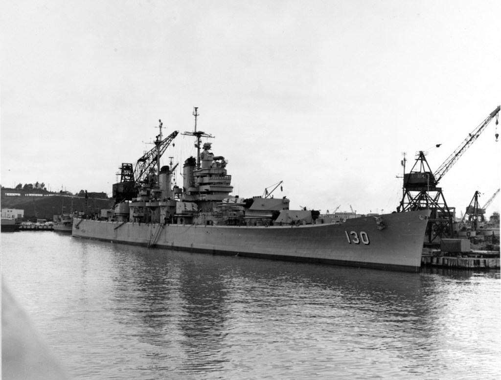 USS Bremerton CA-130 At Hunters Point Naval Shipyard, San Francisco, California, on 21 November 1951. She was recommissioned for Korean War service on 23 November after having been in reserve since April 1948. Official U.S. Navy Photograph