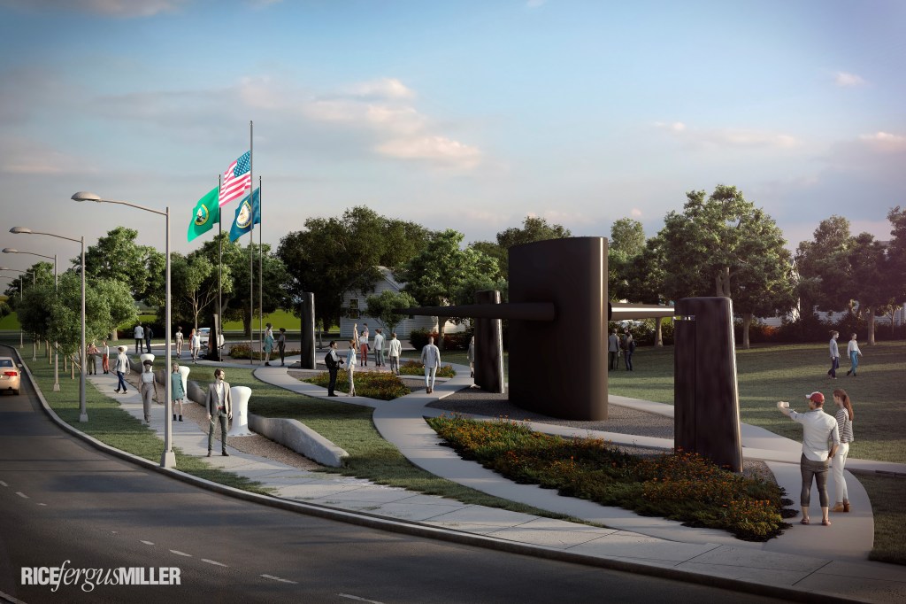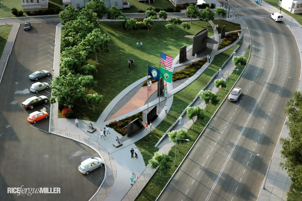 The proximity to the Charleston Gate would make the monument an entry point into Bremerton that demonstrates the relationship between the city, its people and the military history, Wheeler said, and give residents and visitors “an idea of the importance of the military presence in our history.” He highlighted the design in which the crisscrossing grey sidewalks could be a symbol of such connection.