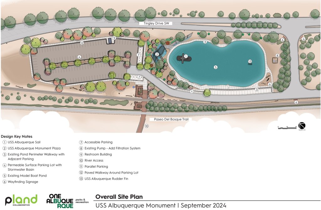 USS Albuquerque: New Mexico cityplans monument at beach. The City of Albuquerque brought the sail of the USS Albuquerque (SSN-706) home last year. This month, the city announced a draft concept plan to build a USS Albuquerque Memorial at Tingley Beach in Albuquerque. The sail of the sub is now in Pascetti Steel in Albuquerque. The steel company will restore the pieces and prepare for reassembly, according to a statement on September 9. The sail had previously been stored at Kirtland Air Force Base after being transported from Bremerton to its namesake city in New Mexico in January 2023. Restoration of the sail is tentatively scheduled to be completed in September next year, and the engineering and design of the monument and plaza are slated to be conducted between this fall and next spring, according to the project website.