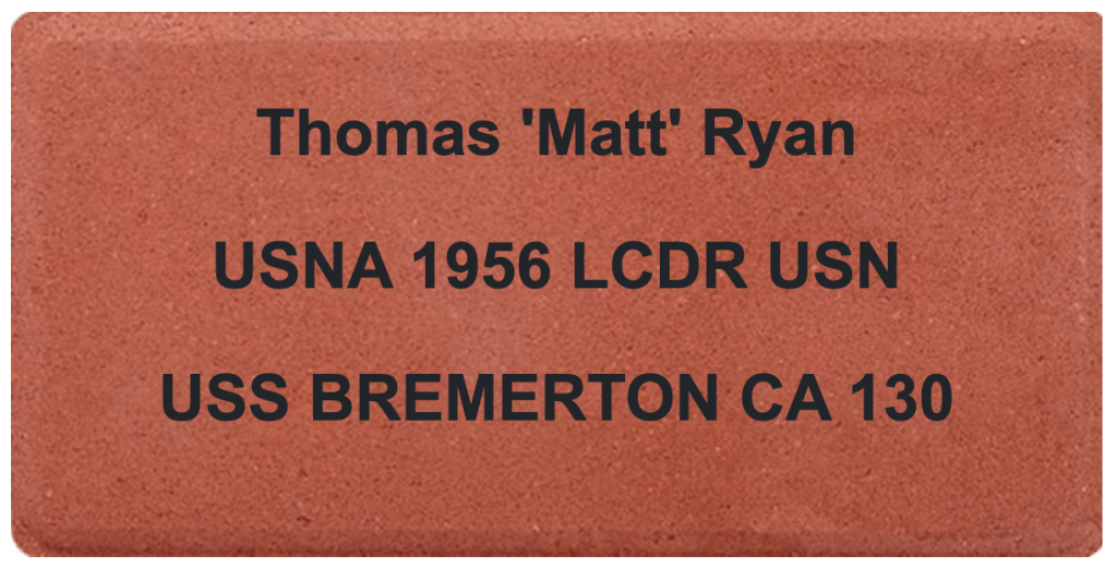 Thomas Matthew “Matt” Ryan passed away on June 18, 2024. A retired U.S. Navy Lieutenant Commander, Matt served his first year of commissioned service in USS BREMERTON (CA-130). A 1956 graduate of the U.S. Naval Academy, Ryan served 20 years as a line officer, qualified for command of World War II-era submarines, and earned the Navy Commendation Medal during the Vietnam era. His naval career remained a defining influence throughout his life, later inspiring one of his novels, One Hell of a Shipmate. After retiring from the Navy in 1976, he built a successful career in insurance and public service, including terms as a Kitsap County Commissioner and chairman of the county Republican Party. He was a lifelong learner and community leader and is survived by his wife of 60 years, four sons, and extended family. Matt’s son, Eric, purchased a brick in honor of his father.
